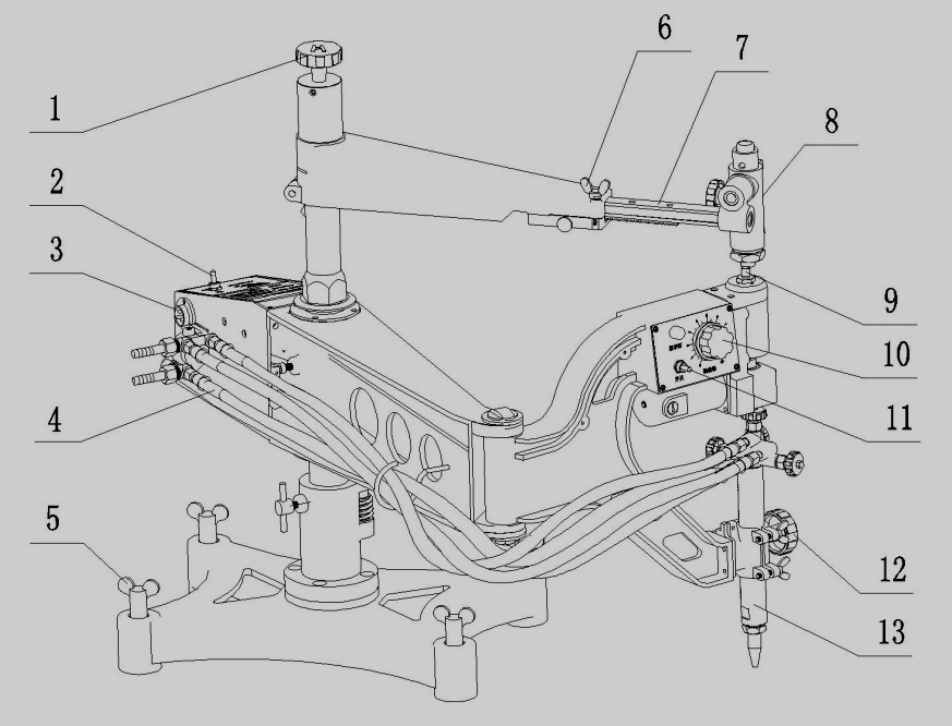 1.形臂升降手輪:松開形臂栓緊螺絲,調節該手輪可使形臂總成總升總降。