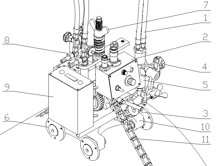 2.電器箱 3.橫向進給旋鈕:改變割炬水平位置 4.割炬升降手輪:調節割炬高度。 5.割炬:切割厚度:5~50mm 6.滾輪:通過四只滾輪使機器在管壁平穩運行 7.大翼形螺母:擰緊該旋鈕,將逐漸收緊鏈條,可使機器牢固的固定在管子上。 8.氣體分配器:可將氣體分為預熱氧、快氧、切割氧 9.鋰電池 10.主體部件 11.鏈條:裝置沿導軌方向隨鏈條傳動而運行 |
