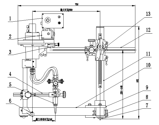 CG2-600-II割圓機(jī)是經(jīng)用戶需要在CG2-600基礎(chǔ)上配以雙把割炬,經(jīng)多方面改進(jìn)研制的一種專用機(jī)型,切割法蘭內(nèi)外圓可一次完成,有效提高了切割效率。本機(jī)采用兩檔變速,調(diào)速系統(tǒng)采用可控硅觸角調(diào)速,調(diào)節(jié)精確。割炬總路設(shè)有總閥,切割同厚度的鋼板只需調(diào)整火焰一次,以后無需再調(diào)整。本裝置配有氣體旋轉(zhuǎn)分配器,膠管不纏繞。本裝置,是切割同心圓零件的良好選擇。有效減少了勞動時間,降低了工人的勞動強(qiáng)度,一定程度地提高了工作效率。切割圓直徑 外徑 Ø200~Ø600,內(nèi)徑 Ø100~Ø500