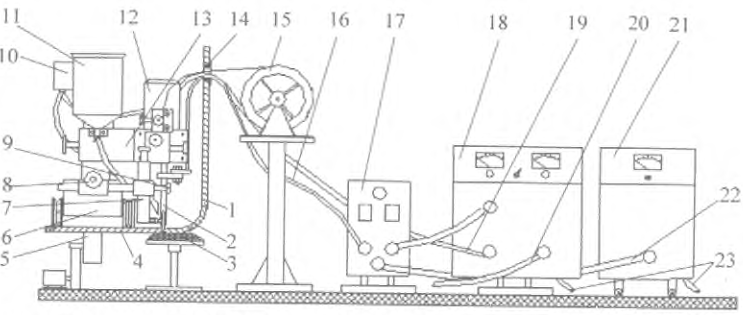 (3)將焊絲盤15及其支架靠近封頭中心外側安放。焊接電源18、轉胎5和電控箱17分別通過動力線23接人供電電源,并按焊接要求互相連接。再將電控線16、焊絲和焊接把線19一并從封頭中心孔進入筒內,將它們與焊接小車的相關部分連接。