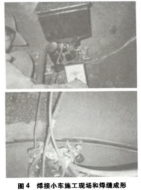 (4)焊接過程中,焊縫跟蹤器7將始終為焊接小車導向。在焊接臨近頭尾相接時。跟蹤輪將失去焊縫依托,但靠原已形成的導向作用延續,焊接小車仍會沿焊接反向繼續前進直至與焊接起點重合。完成焊縫對接后,按下焊接操作盒10上的“停止焊接”按鈕,內環縫焊接結束。焊接小車施工現場和焊縫成形如圖4所示
