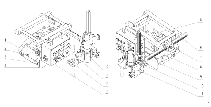 14. 焊槍夾持器總成:是焊槍的夾持裝置,可以方便地進(jìn)行維修、調(diào)整和焊槍的拆卸。