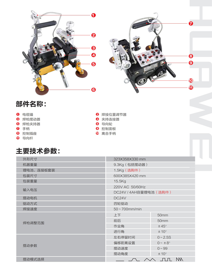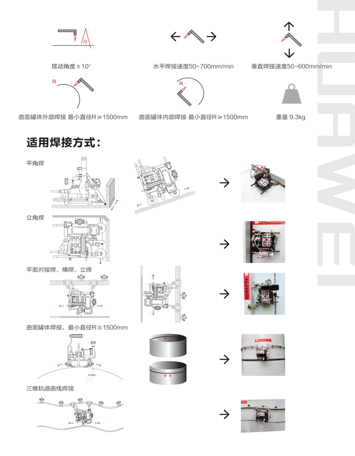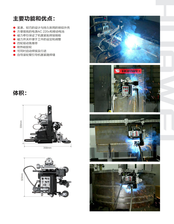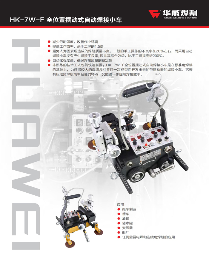 減少勞動強(qiáng)度,改善作業(yè)環(huán)境。提高工作效率,是手工焊的1.5倍。避免人為因素所造成的焊縫質(zhì)量不良,一般的手工操作的不良率在20%左右,而采用自動焊接小車沒有產(chǎn)生焊接不良率, 因此其綜合效益,比手工焊提高近200%。自動化程度高,確保焊接質(zhì)量的穩(wěn)定性。非熟練的技術(shù)工人也能快速掌握:HK-7W-F全位置擺動式自動焊接小車是在標(biāo)準(zhǔn)角焊機(jī)的基礎(chǔ)上,為獲得較大的焊縫尺寸并且一次成型而開發(fā)出來的帶擺動器的焊接小車。它兼有標(biāo)準(zhǔn)角焊機(jī)簡單輕便的特點(diǎn),又能進(jìn)一步提高焊接效率。