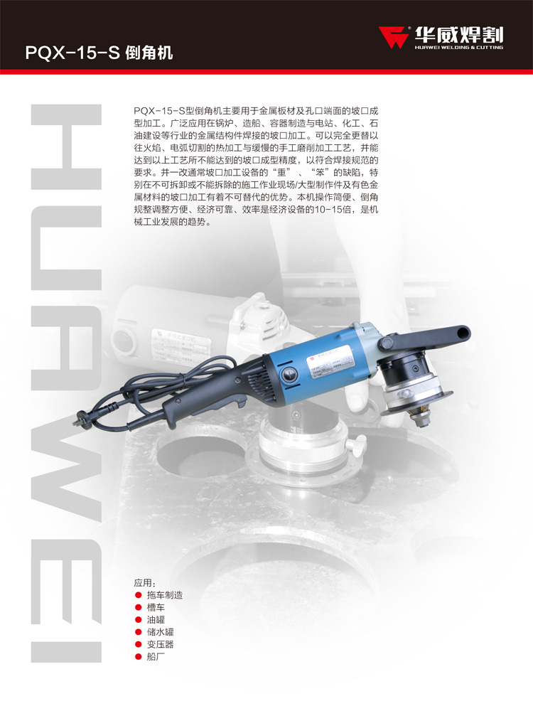 PQX-15-S型倒角機主要用于金屬板材及孔口端面的坡口成型加工。廣泛應用在鍋爐、造船、容器制造與電站、化工、石油建設等行業的金屬結構件焊接的坡口加工??梢酝耆嬉酝鹧妗㈦娀∏懈畹臒峒庸づc緩慢的手工磨削加工工藝,并能達到以上工藝所不能達到的坡口成型精度,以符合焊接規范的要求。并一改通常坡口加工設備的“重” 、“笨”的缺陷,特別在不可拆卸或不能拆除的施工作業現場/大型制作件及有色金屬材料的坡口加工有著不可替代的優勢。本機操作簡便、倒角規整調整方便、經濟可靠、效率是經濟設備的10-15倍,是機械工業發展的趨勢
