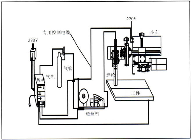 全位置自動焊接小車是一種半自動焊接設(shè)備,由小車本體、驅(qū)動裝置、控制裝置、焊槍夾持裝置組成。人工輸入工藝參數(shù)后,能夠按照一定運行軌跡實現(xiàn)全方位自動焊接。全位置自動焊接小車在10年前由國外(韓國、德國)引進,目前該技術(shù)已經(jīng)逐步國產(chǎn)化,并有部分企業(yè)開始生產(chǎn)該產(chǎn)品。該自動焊接裝置投資少,重量只有10kg左右,可隨‘丁件移動,只需與T廠現(xiàn)有的氣體保護焊機和220V電源簡單連接即可操作(如圖1)。操作門檻低,工人只需稍有焊接基礎(chǔ),簡單培訓(xùn)后即可上崗操作。全位置自動焊接小車有兩種行走方式,一種是沿專用軌道行走,軌道靠專用磁鐵或吸盤吸附在被焊接『[件上,采用齒輪齒條方式驅(qū)動。軌道有剛性軌道和柔性軌道兩種,剛性軌道走直線,實現(xiàn)平直或豎直焊縫自動焊接;柔性軌道可以隨工件焊縫彎曲,實現(xiàn)環(huán)形焊縫自動焊接。另一種是采用磁輪行走機構(gòu),小車靠強磁車輪吸附于工件表面,用導(dǎo)向輪定位,沿著焊縫行走,可以實現(xiàn)直線和曲線自動焊接。全位置自動焊接小車一般設(shè)有一個或兩個焊槍夾持裝置,用來夾持普通氣體保護焊機的焊槍。焊槍夾持裝置設(shè)有專用直線往返式擺動裝置,用數(shù)字方式調(diào)節(jié)擺動幅度、中心位置的移動、左停止時間、右停止時間及擺動速度,并具有停止焊接時焊槍自動停止在中心回位的功能。自動焊接擺動小車,與手工焊接相比,焊接幾乎不受焊工技術(shù)水平的影響;焊接過程穩(wěn)定,缺陷少,焊縫表面清潔,焊接質(zhì)量提高;焊接過程中,焊絲可以連續(xù)送進,熔敷速度快,減少了焊工換焊條或變換姿勢或休息的時間,大大提高了生產(chǎn)率;可進行一次性長距離焊接,焊接過程飛濺小,煙塵少,可以一人操作兩臺設(shè)備,大大降低了工人的勞動強度。