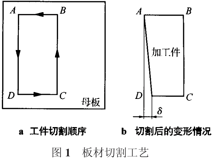 在數(shù)控等離子切割過(guò)程中選擇合理的切割工藝,所產(chǎn)生的變形量也不同。如在切割圖 l 所示的板材時(shí),若選擇 A 點(diǎn)為起弧點(diǎn),切割方向和順序?yàn)锳!D!C!B!A,如圖 la 所示。當(dāng)完成 AD 段的切割,加工 DC 段時(shí),由于 DC 段余料窄,切割時(shí)高溫使 DC 段余料產(chǎn)生線性伸長(zhǎng),CB 段向外偏轉(zhuǎn),切割后使 DC 段尺寸縮小 ! ,如圖 lb 所示, ! 的大小與DC 段的尺寸成正比。如果選擇 A!B!C!D!A 的切割順序,工件最后經(jīng) DA 與母板分離,可有效減小切割變形。