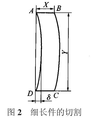 對(duì)于如圖 2 所示細(xì)長(zhǎng)件的切割,若按 A!B!C!D!A,當(dāng)切割 DA 段時(shí),BC 段的膨脹可阻止 CD段的膨脹,完成整體切割冷卻后,DA 段的收縮量要大于 BC 段的收縮量,使工件向 DA 側(cè)彎曲。旁彎量! 的大小取決于加工件的長(zhǎng)寬比 Y!X,長(zhǎng)寬比越大,旁彎量 ! 就越大。