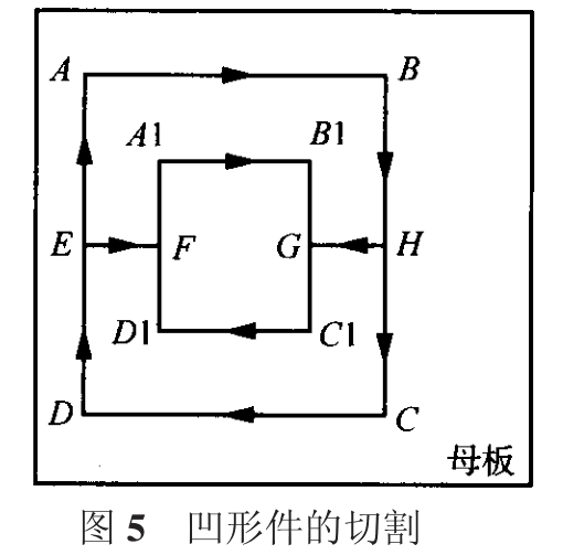 (l)對(duì)于凹型件采取兩件配對(duì)切割的方法,先切割內(nèi)邊,后切割外邊,最后由外向內(nèi)使兩件分開(kāi)。切割順序如圖 5 所示,內(nèi)邊:Al!Bl!Cl!Dl!Al;外邊:A!B!C!D!A;切斷:E!F,H!G。
