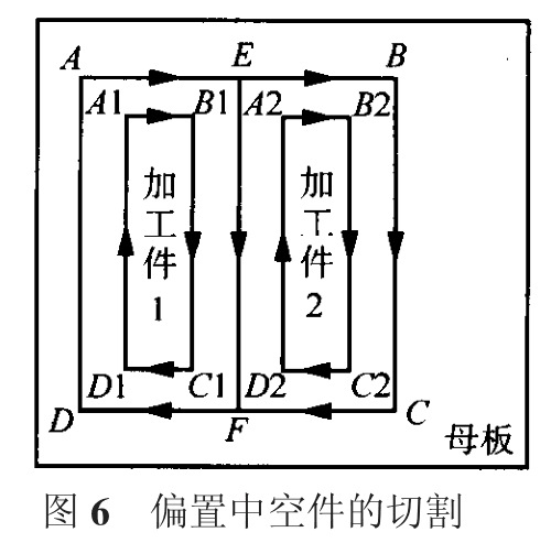 (2)對(duì)于偏置中空件應(yīng)采取兩件配對(duì)切割,最后使兩件分離。切割順序如圖 6 所示,內(nèi)邊:Al!Bl!Cl!Dl!Al,A2!B2!C2!D2!A2;外邊:A!B!C!D!A;最后 E!F。